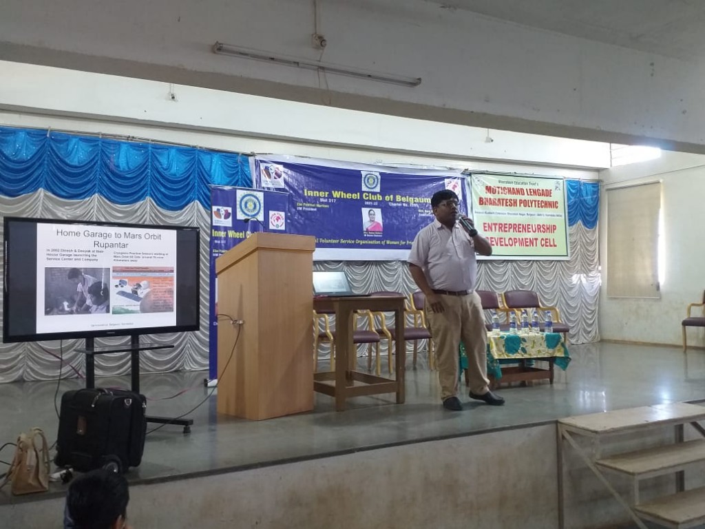 Workshop was inaugurated by the leading entrepreneur Shri.Deepak Dhadooti, Managing Director, Servo Control, Belagavi. Smt.Sushma Shetty, President of Inner Wheel Club, Dr.Savita Kaddu, Secretary, & Smt.Medha Shah, Event Chairman, Principal Shri.B.M.B.Patil, & Technical Director Shri.S.N.Tulasigeri, were present. An young entrepreneurs Mr.Karan Javali, CEO, Wheels on the road, Mr.Veerendra Kadam, CEO, Delta System E-Forming, Mr.Akshay Khataria, Owner of the Tea & Toast Company, Belagavi. Mr.Akshay Kulkarni, Project Manager were inspired the students. Smt.Keerti Shivakumar, Rtd, Professor enlighten on “Mental & Physical Strength” and “Atma Shraddha and Santhulana”. Prizes are distributed for the students who presented best marketing strategies at the end of the workshop. Training placement officer Shri.Girish Kadakol, and ED Cell Co-ordinator Shri.V.V.Savanur, Sl.Gr.Lecturer & HR Co-ordinators of all the Department were present.